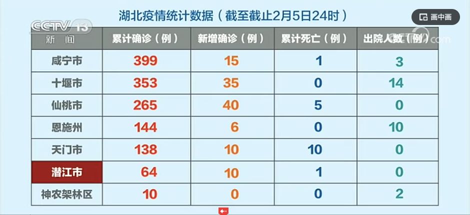 据数据显示,截至2月5日24时,潜江市的疫情统计数据显示,累计确诊病例64例,新增确诊病例10例,累计死亡1例。