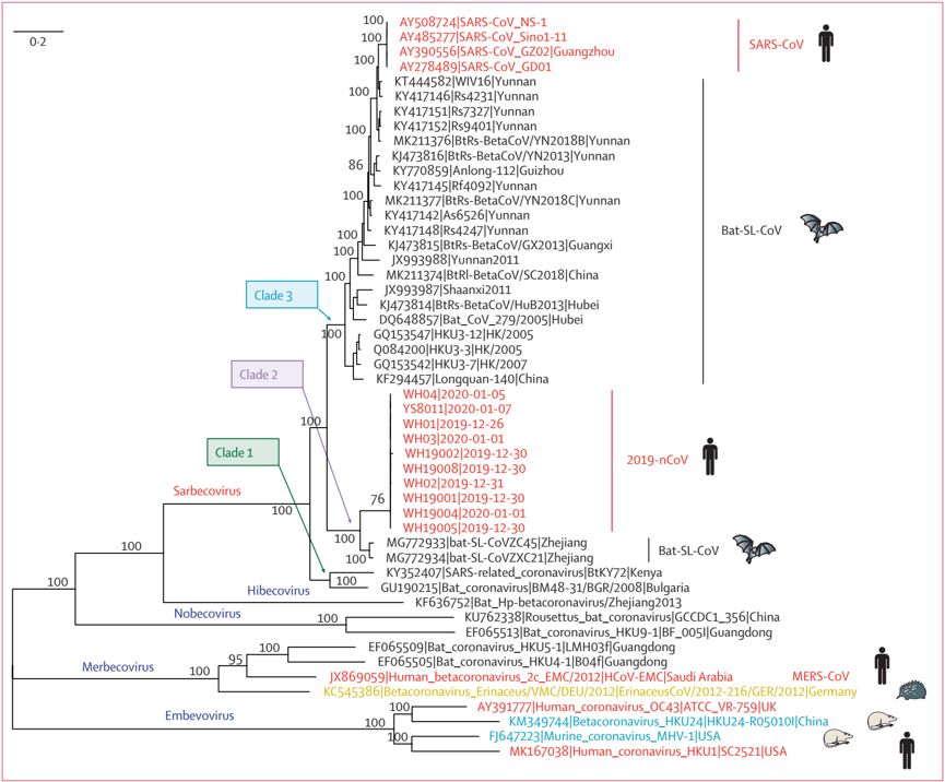 冠状病毒遗传进化分析,其中图中2019-nCoV即为本次新型冠状病毒。注:图片来源https://doi.org/10.1016/S0140-6736(20)30251-8