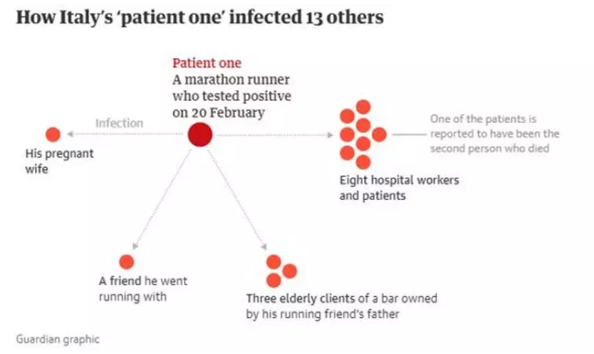 在传染病防控中,这样的病人我们有个专业的名词,叫做超级传播者。而一旦一个地区出现超级传播者,则往往意味着当地疫情防控形势将变得异常严峻。在意大利的这次“1号病人”事件中,意大利的困境是至今尚未找到传染给这位1号病人的0号病人,而后续病例大量的增加,甚至提示在1号病人之前,可能也已经有了其他的感染者。这让意大利政府至今无法清晰地说明,在没有新增病例的那两周,国内疫情是如何传播的。