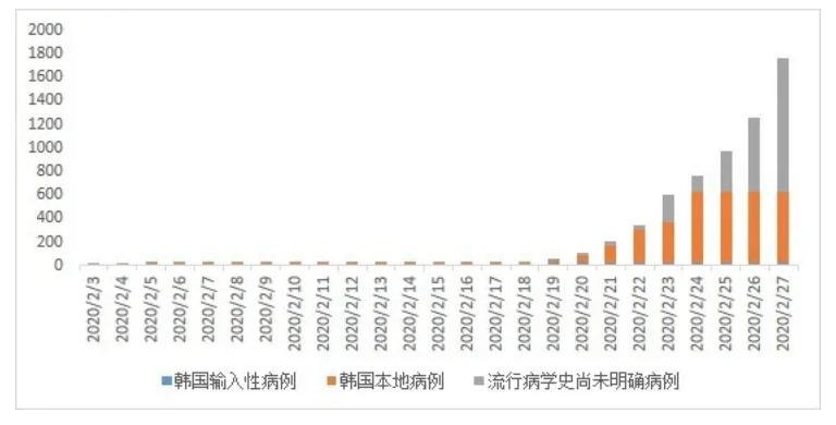 1月20日至2月17日可以认为是韩国疫情的第一阶段,当时韩国的第一例确诊病例为从武汉入境的中国籍女性,至2月11日,韩国累计确诊病例28例,到2月14日连续3日无新增病例。从当时的情况看来,韩国成功控制了输入性病例,将疫情控制在了早期阶段。