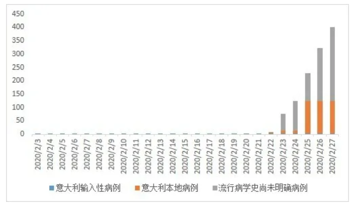 最初3例病例都是输入性病例,患者都和武汉有关。在之后两周内,意大利也未出现新的确诊患者。
