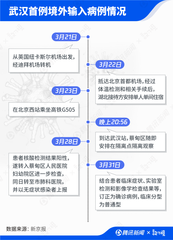 3月31日,湖北省新增无症状感染者47例,当日转确诊1例,为境外输入病例;解除隔离289例,尚有982例无症状感染者正在接受医学观察。这是武汉首次出现境外输入病例,该病例之前上报为无症状感染者。