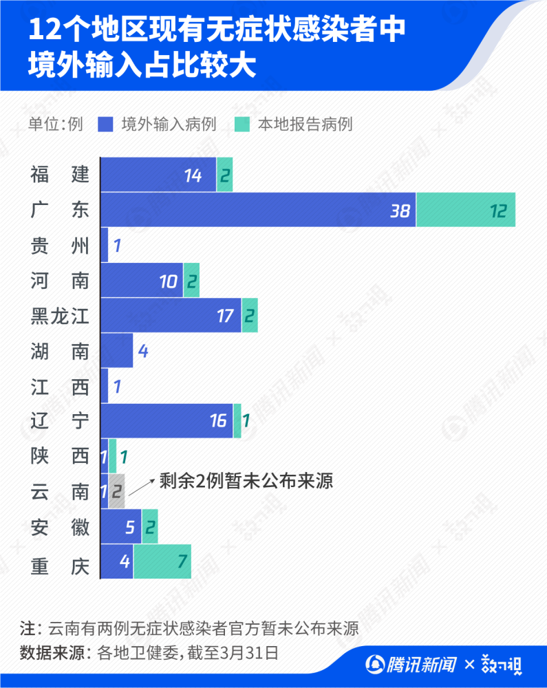 截至4月1日18点,包括湖北在内的14个省份公布了现有无症状感染者数据,合计为1126例,其中,湖北地区现有无症状感染者为982例。在公布了无症状感染者来源是否为境外输入的12个省份中,境外输入的无症状感染者占整体的比例高达78%,其中贵州、湖南和江西的现有无症状病例均为境外输入。