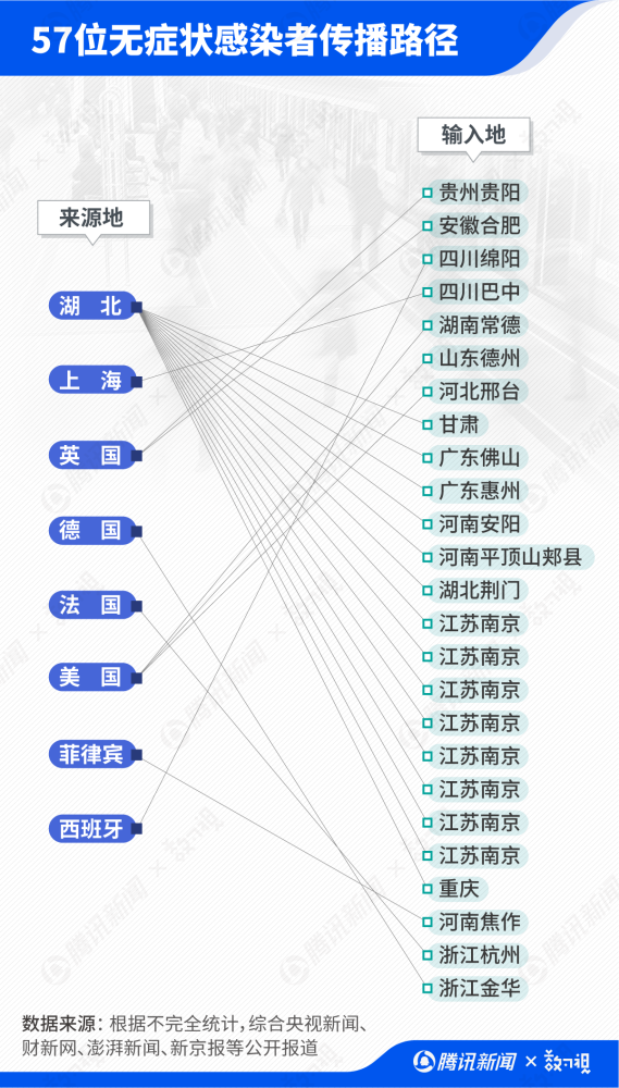我们综合央视新闻、财新网、澎湃新闻和新京报等媒体的公开报道,梳理发现了57位无症状感染者的详细信息,在来源地方面,1-2月,这些无症状感染者主要来源地为湖北;随着全球疫情蔓延,3月份来源地出现了西班牙、英国、菲律宾等地,最终这57位无症状感染者中境外输入占比为15.8%,大致与国家卫健委公布的13%相吻合。