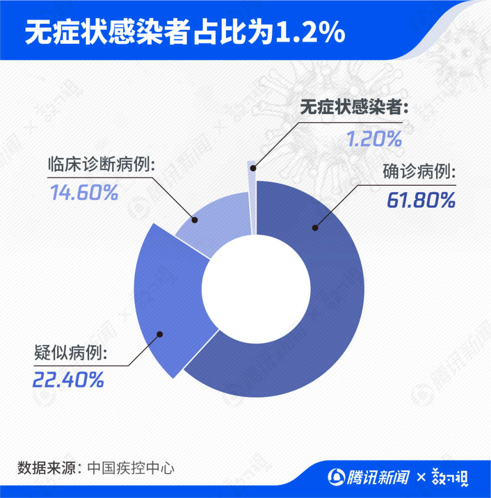 无症状感染者占整体比例如何?中国疾控中心发表在《中华流行病学杂志》的一篇论文显示,截至2月11日,中国内地共报告72314例病例,其中,确诊病例44672例(61.8%)、疑似病例16186例(22.4%)、临床诊断病例10567例(14.6%)、无症状感染者889例(1.2%)。