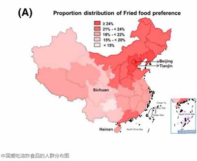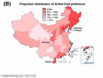 研究显示,居住在不同地方的人群喜欢的食物也有差异:油炸和烧烤类食物是北京和东北及周边地区人群最爱。海南南部地区的人也偏爱烧烤。广东虽然比不上北京,但也显示了对油炸和烧烤的爱。