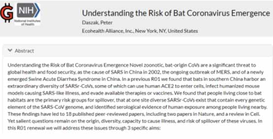 2014年6月,美国国家卫生研究院(NIH)网站发表了彼得·达扎克博士撰写的项目介绍Understanding the Risk of Bat Coronavirus Emergence。截图如下: