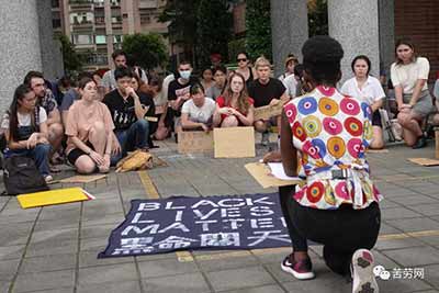 美国非裔男子佛洛伊德遭白人警察以膝压颈致死,引爆美国近年来最大示威潮,民众上街反对长年未解的种族歧视和警察暴力,高喊「黑命关天」(Black Lives Matter)。今日(6/5)也有非裔学生在台大校园举办抗议活动响应,约50名民众到场参与,他们自制布条和标语,一同歌唱抗争歌曲、单膝跪地向死者致意。