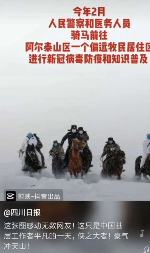 为了前往阿尔泰山区的偏远牧民居住区进行新冠肺炎防疫知识普及,人民警察和医务人员冒雪骑马前行。 而这只是无数中国基层工作者平凡的一天,不让一个人落下。