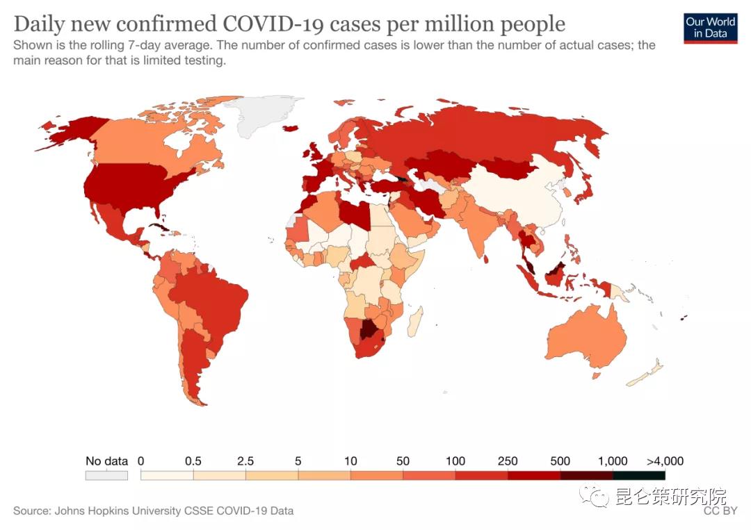 【根据WHO数据显示,截至2021年8月12日,全球累计确诊人数累计超过约2.04亿,死亡人数超432万,全球接种疫苗数44.2亿。 图为累计确诊(每百万)全球概况。】