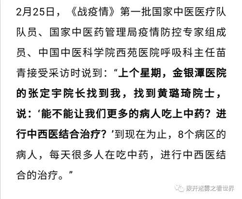苗青:“以我现在所在的金银潭医院为例,我们在里面呢,管着一个病区,用中医中西结合这样一个治疗。那后来呢,上个星期他们张定宇张院长找到我,找到我们黄璐琦院士,说能不能让我们更多的病人去吃上中药,进行中西结合治疗?那到现在为止呢,我知道大概八个病区的病人,每天很多人在吃中药,在进行中西医治疗。我想在武汉的其他地区也都是这样。”
