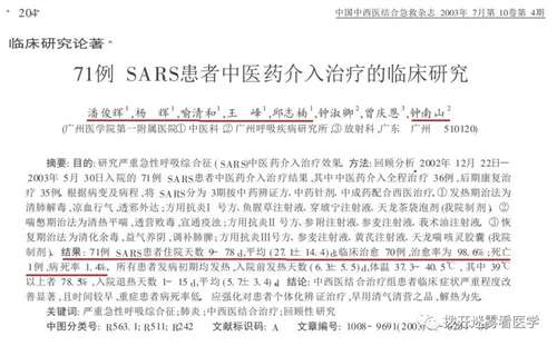 钟南山请来中医科的潘俊辉、杨辉、喻清和、王峰、邱志楠5位中医,中医药介入治疗的71例SARS患者,治愈70例,只死亡1例。