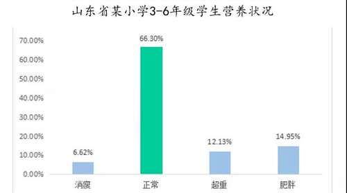 这是我们调查的山东一个百强县里的小学。营养学界用体脂指数(BMI)来衡量儿童生长发育情况。我们测试结果发现,这所小学里BMI指标正常的学生只有66%点几,消瘦的学生有6%点几,这个跟全国平均水平差不多,但是肥胖和超重的学生超过27%,这就很严重了,近三分之一的学生肥胖和超重,这都是小学生,长期这样下去长大会有慢性病的危险。我们观摩孩子们上体育课,肥胖和超重的问题还是比较大的。