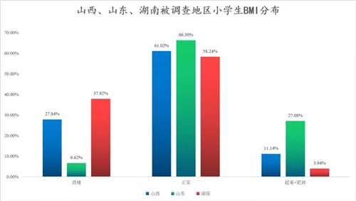 中间绿色的柱子是山东,经济条件最好的地方,营养状况也没有好多少,BMI正常的只比其他地方高百分之几。但是山东的学生消瘦率是很低的,只有6.62%,而超重和肥胖率却很高。