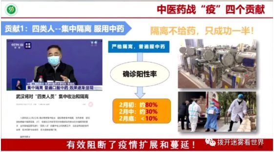 隔离人员的确诊率,在2月初是80%;中药漫灌后,到2月中下降为30%,2月底下降为10%。