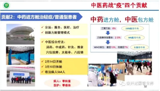 方舱医院的病人,90%都服用了中药,转重症的比例是2%-5%,远低于WHO报告的重症13%、危重症7%的比例。