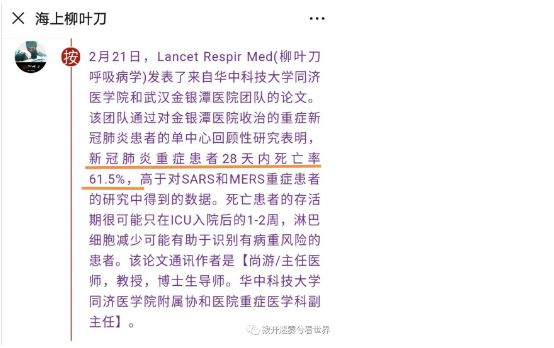 当时武汉新冠病人的死亡率非常高,2020年2月21日的论文显示,金银潭医院重症病人28天死亡率高达61.5%。