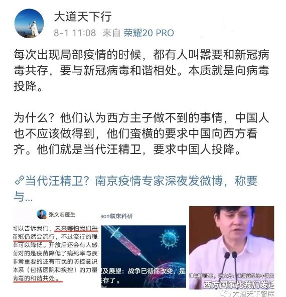 2021年7月底南京疫情爆发,国内的网红专家再次鼓吹“全民注射疫苗”后“与病毒和谐共处”。