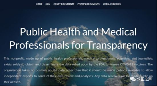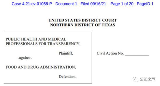 2021年9月16日,美国“公共卫生和医疗专业人员透明组织”(Public Health and Medical Professionals for Transparency,PHMPT)向德克萨斯州北区的美国地区法院起诉FDA(Food and Drug Administration,食品药品管理局),要求FDA马上公布辉瑞公司(Pfizer,Inc.)疫苗的全部文件(参考文献[1])。