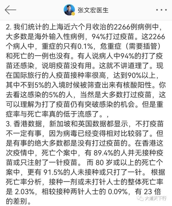 张文宏又说香港新冠病人死亡率高,是因为死的人大部分没有打疫苗。