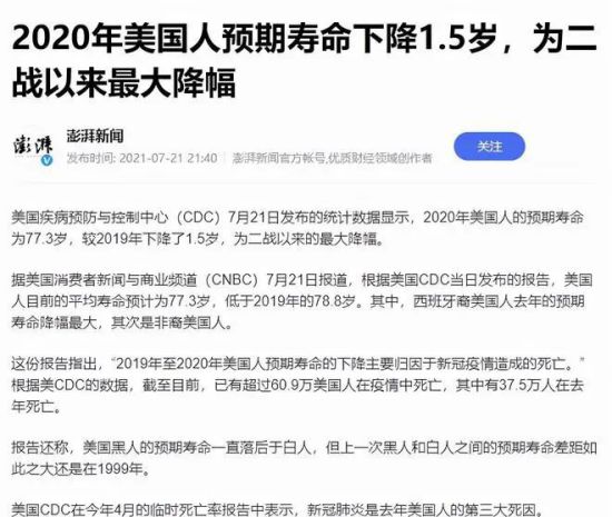 更有力的证据,是美国的人均寿命变化,2021年美国人口人均的寿命比预期的还要少很多,人均减少1.5岁,这是二战以来最大幅度的人均寿命下降,刷新了记录。