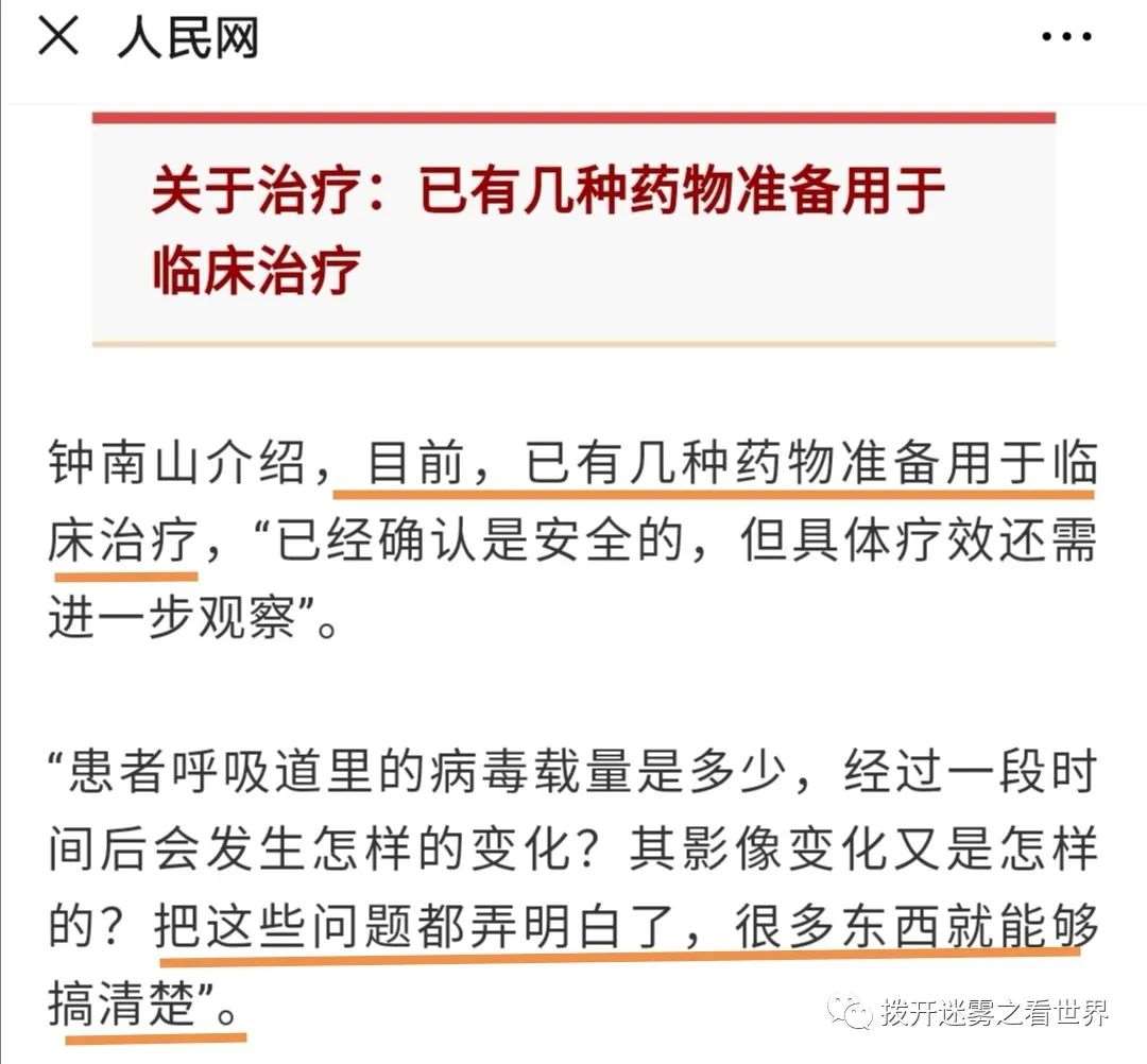 钟南山表示,目前,已有几种药物准备用于临床治疗,“已经确认是安全的,但具体疗效还需进一步观察”。