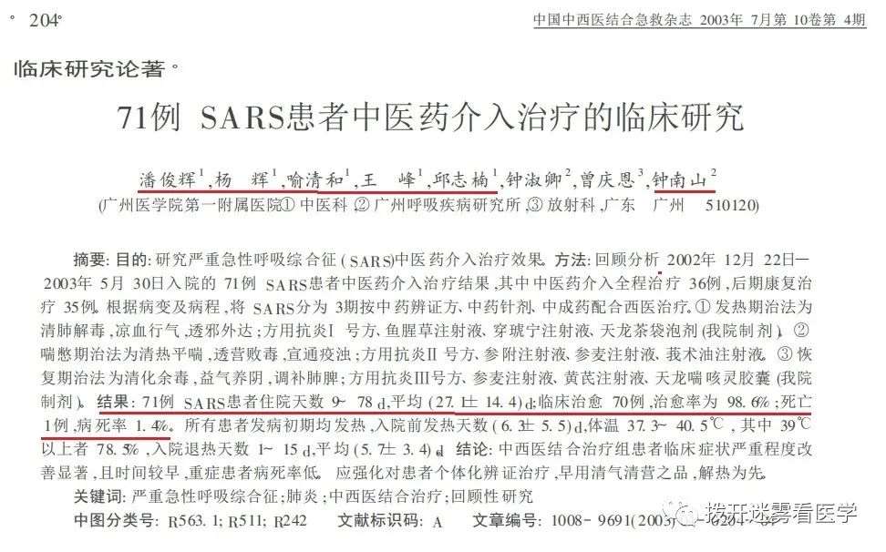 这件事,也有钟南山参与写作的论文《71例SARS患者中医药介入治疗的临床研究》为证。