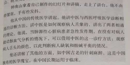 经过充分准备,钟南山从中医传统讲起,讲了中医与西医呼吸医学的诊断,讲中医是如何观察病人舌象的。他指出,当肺源性心脏病急性发作期,通过舌头颜色就可以判断病人缺氧和酸碱平衡的情况,还介绍了中医针刺麻醉等等。