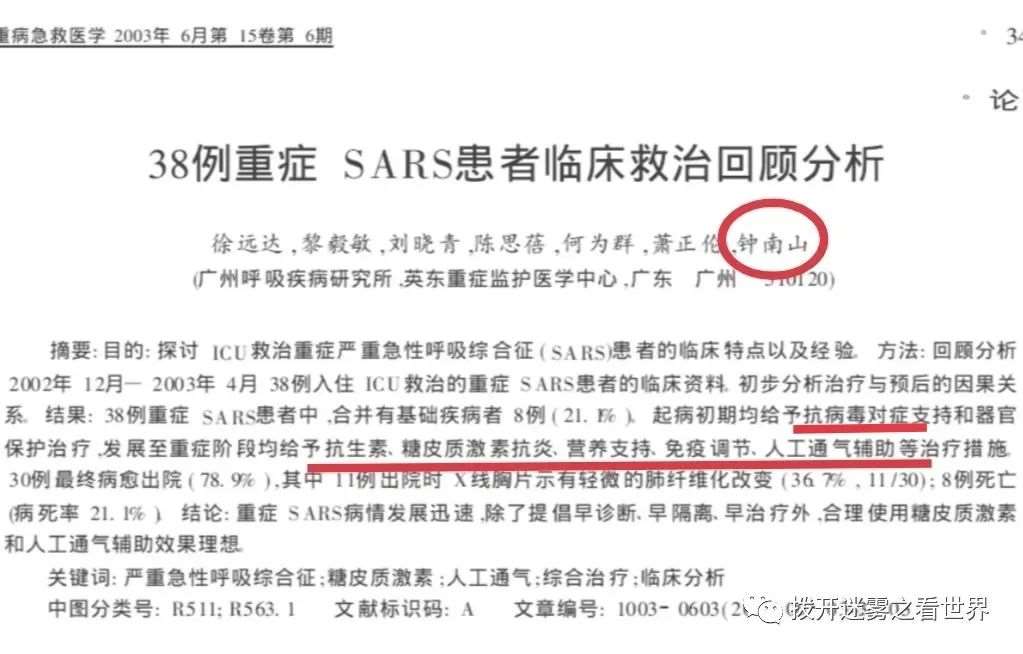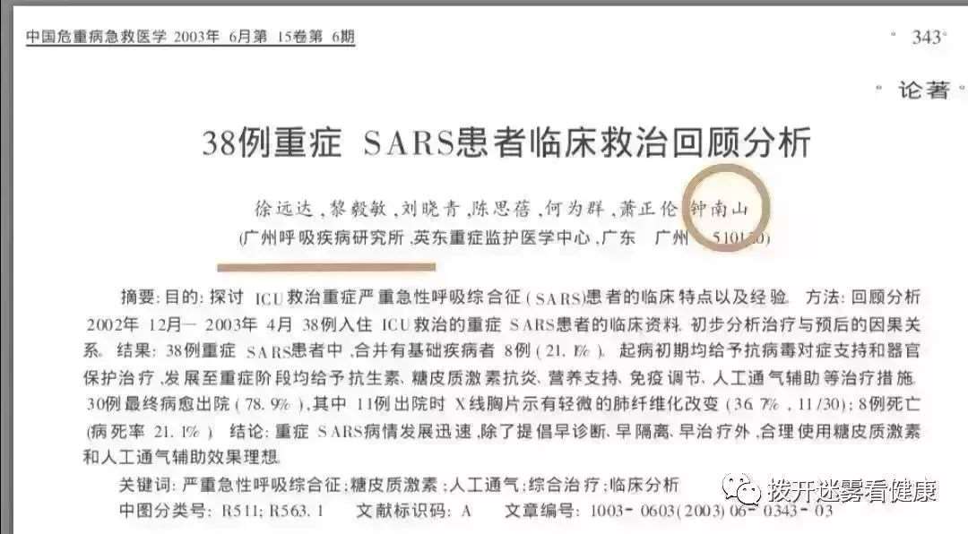 广州呼吸疾病研究所的论文《38例重症SARS患者临床救治回顾分析》记录了钟南山的治疗方法和效果。