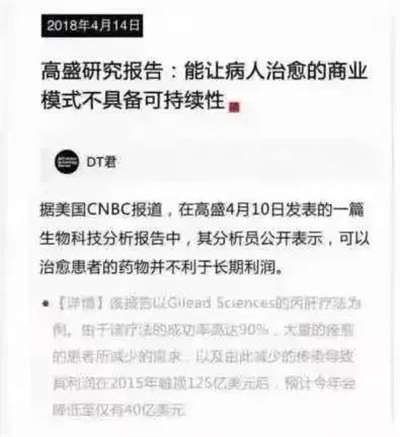 根据 CNBC(美国消费者新闻与商业频道)的报道,高盛的生物科技报告,一不小心揭开了医药研发的潜规则:瑞德西韦生产的吉利德,就因为药效太好彻底消灭了丙肝,导致现在无钱可赚,股价常年低迷……快速甚至是一次性治愈患者的商业模式并不利于长期利润。让病人终身服用才是药物开发的最高法则,才能为医药集团带来利润。