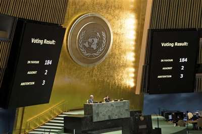 ▲ 2021年6月23日,在联合国大会举行的会议上,共有184个国家投票赞成通过决议,要求美国结束对古巴的经济封锁,而美国和以色列投了反对票。这是联大连续第29年通过类似决议。