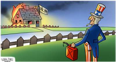 ▲ 美国在乌克兰危机中不断煽风点火,加剧紧张局势,自己却在大西洋彼岸隔岸观火。 (漫画|刘蕊)