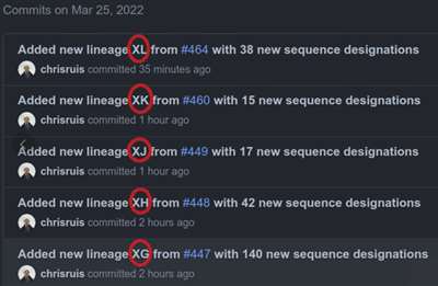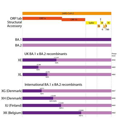 然后光是奥密克戎BA.1和BA.2两个毒株之间,就重组出了英国版(XE、XL)、丹麦版(XG、XH)、芬兰版XJ、比利时版XK。