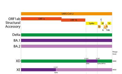 上面这张图显示,XD版是以德尔塔为基础,取了一段BA.1的基因组成的;XE版是奥密克戎BA.1和BA.2组合的;