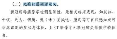 新冠病毒病原学检测呈阳性,无相关临床表现,如发热、 干咳、乏力、咽痛、嗅(味)觉减退、腹泻等可自我感知或可临床识别的症状与体征,且 CT 影像学无新冠肺炎影像学特征者。