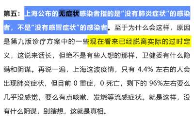他认为这些人还来不及做CT,所以只能算「疑似」,而卫健委只要求公布「无症状」和「确诊」的数字,上海疾控的人就只好把疑似患者也列入无症状患者上报。