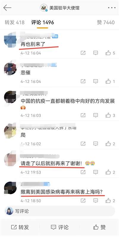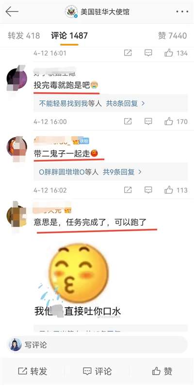 美国驻华大使馆的微博评论区,很多网友下意识地作出了判断:“投完毒就跑是吧”。