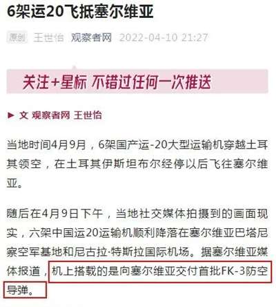 4月9日,六架中国运20军用运输机飞抵塞尔维亚,送去了中国产的FK-3防空导弹。