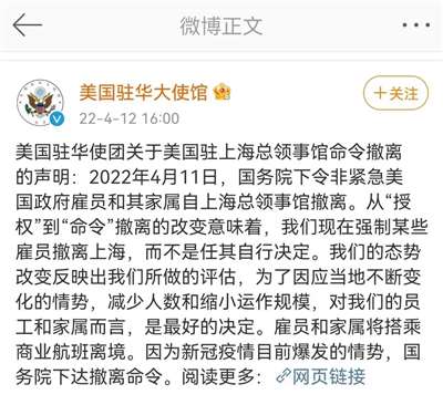 疫情爆发初期物资保障不足、社会面管理混乱的时候,美方驻上海总领馆不撤离,为啥却在疫情拐点初现的时候"强制撤离"呢?