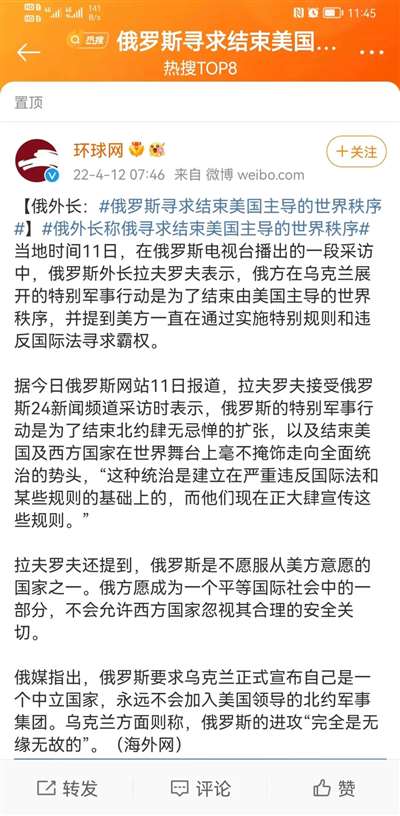 4月11日,俄罗斯外长拉夫罗夫公开表示,俄在乌克兰的“特别军事行动”,意在终结美国主导的世界秩序。