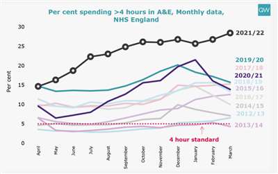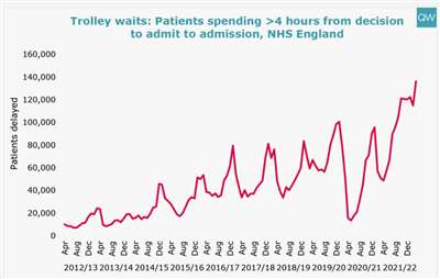 2022年3月,还是有28%的急诊病人等候时间超过4小时,再一次打破NHS急诊等候史上最烂记录;