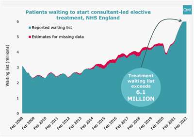 2022年2月,总共618万人在等待择期住院治疗,创下历史记录(比上个月再加8万);