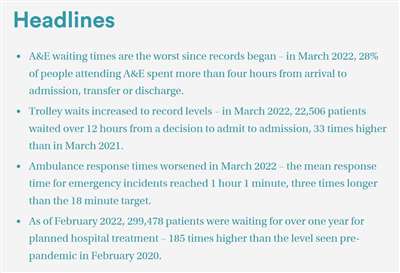 下面咱就继续搬运昨天半夜新鲜上线的Nuffield Trust《NHS月度表现评估报告,2022年2-3月》,