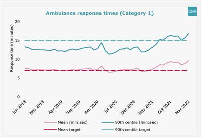 2022年3月,NHS救护车一类事故(致命伤)的平均响应时间继续上涨到了9分35秒,打破历史最烂纪录,超出指标值7分多钟;