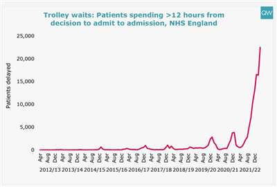 2022年2月,等待择期治疗超过一年的人数接近30万……是大流行开始前的2020年2月的185倍。