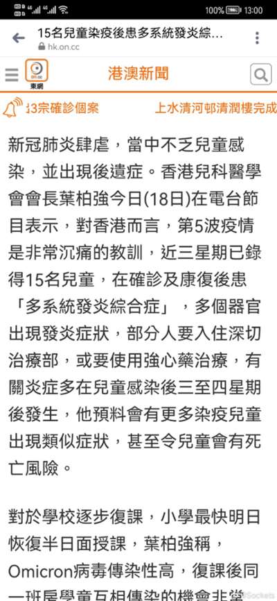 最新的一个消息,4月18日,香港儿科医学会会长叶柏强在电台节目中表示,近三个星期已录得15名儿童,在确诊及康复后患“多系统发炎综合症”,即多个器官出现发炎症状,部分人要入住深切治疗部,或要使用强心药治疗,有关炎症多在儿童感染后3-4个星期后发生。他预料会有更多染疫儿童出现类似症状,甚至令儿童会有死亡风险。