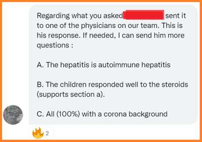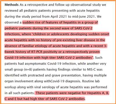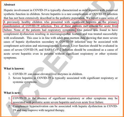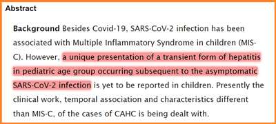 新冠检测阳性后3-6周期间突发急性肝炎,其中8例为MIS-C,另外25例为不明病因肝炎;