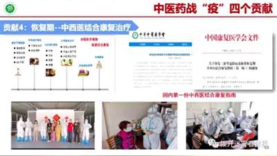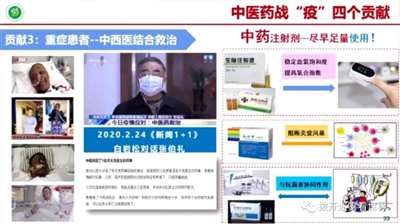 张伯礼、刘清泉、仝小林、黄璐琦等纷纷奔赴武汉,长期在第一线指导中西医结合抗疫,总计4900多名中医医务人员驰援湖北,成建制接收病区,还包括一个方舱医院。在全国确诊的病例中,中医药参与治疗的病例达到了93%,系统性的确立了三药三方。