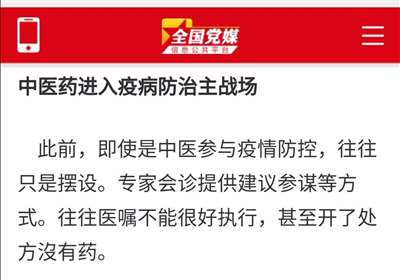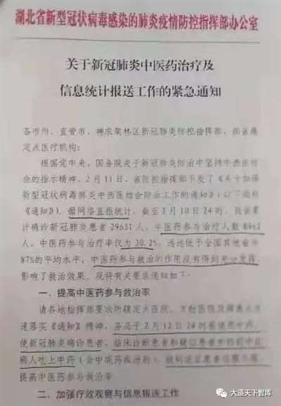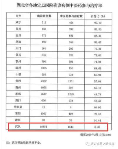 湖北疫情指挥部的文件指出:截止2月10日24时,湖北中医药参与治疗率仅为30.2%,远远低于全国其他省份87%的平均水平,影响了救治效果。