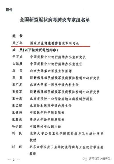 2020年2月8日,国家调整了新冠专家组名单,梁万年成为组长。张伯礼、刘清泉等中医药专家加入工作组。
